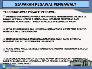 Mengawal kerugian yang ditanggung oleh Kerajaan akibat kehilangan aset. Kementerian Kewangan selepas diperakukan oleh Pegawai Pengawal kementerianagensi masing-masing. PENGURUSAN KEWANGAN AM BIL PERKARA PERATURAN PELAKSANAAN HARIAN BULANAN MENGIKUT KEPERLUAN A1 PENURUNAN KUASA AP 11 AP 53 AP101 1 Diberi kepada pegawai yang terlibat dalam pengurusan kewangan secara bertulis oleh.